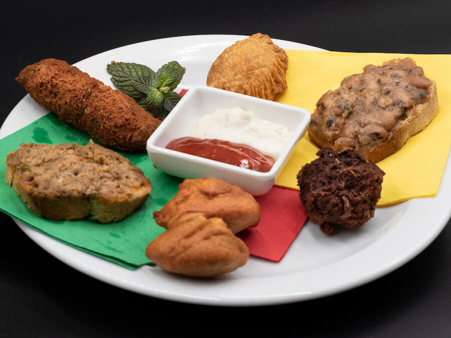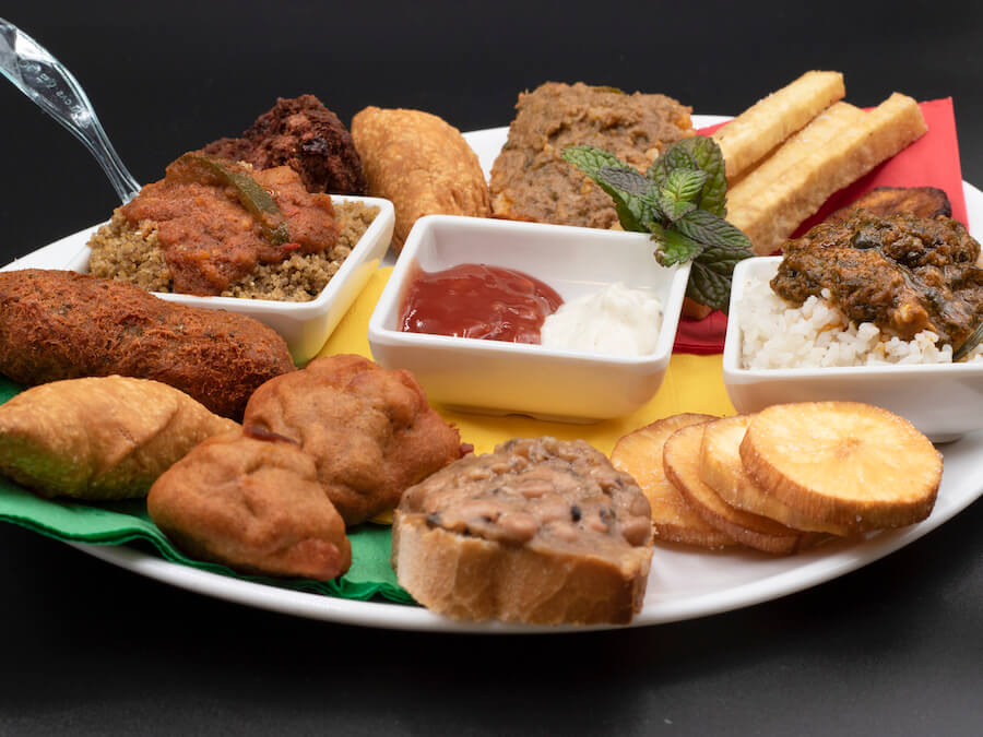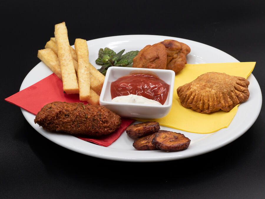 Akarà niebe – Fataya verdure – crocchette di yuca – yam fritto – crostino di pane – yuca fritta