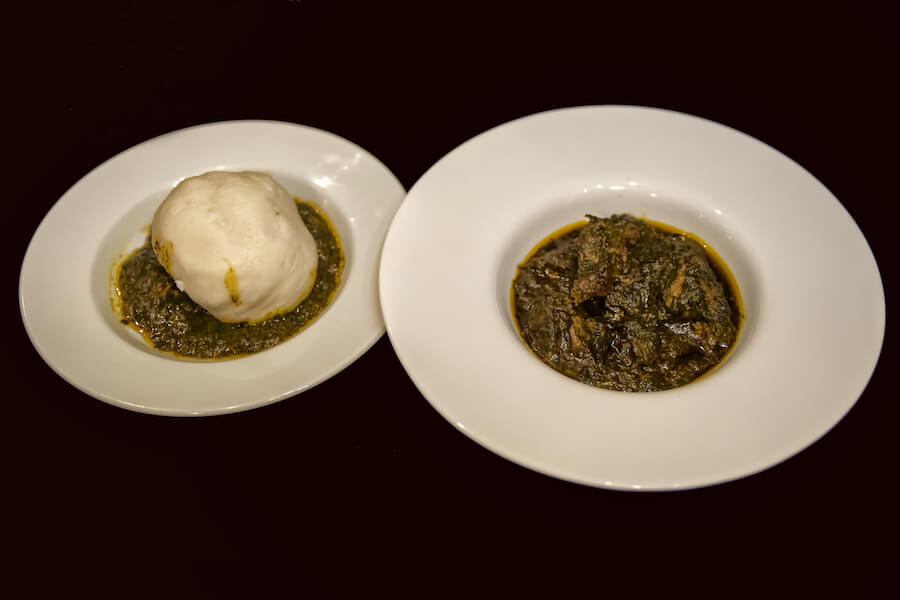 Pasta con spezzatino di carne, salsa di spinaci con olio di palma e burro di arachidi – Pâtes avec ragoût de viande, sauce aux épinards avec huile de palme et beurre d’arachide – Pasta with meet stew, spinach sauce with palm oil and peanut butter