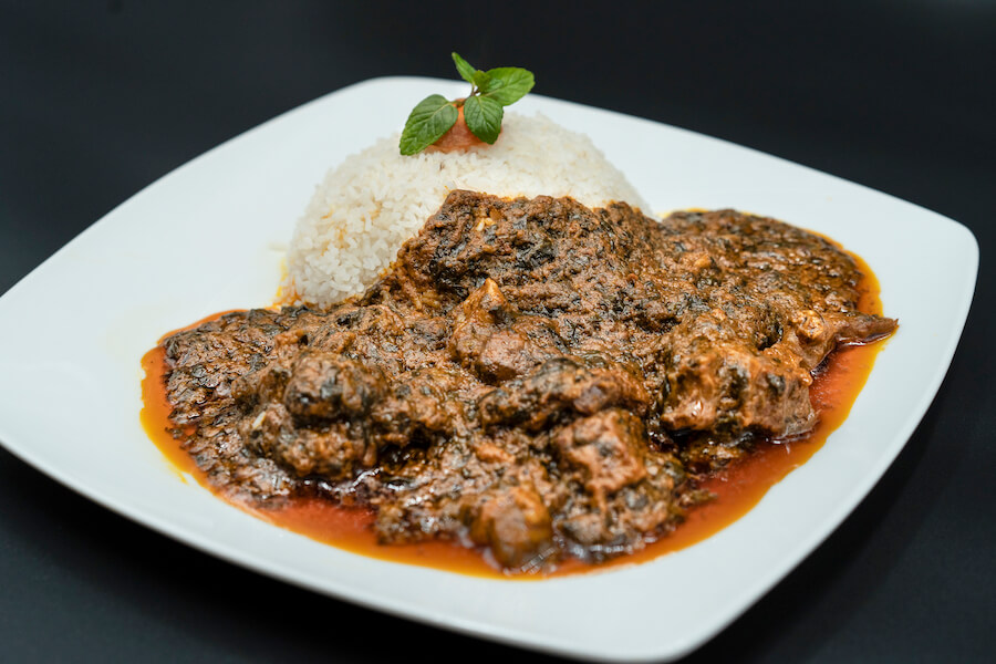 Bocconcini di carne, salsa di spinaci con olio di palma e burro di arachidi, serviti con riso bianco spezzato – Petit morceaux de viande, sauce aux épinards avec huile de palme et beurre d’arachide, servi avec du riz blanc cassé – Meet morsel, spinach sauce with palm oil and peanut butter, served with broken withe rice