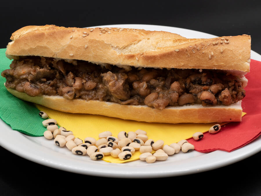Panino con salsa di fagioli occhio nero e carne – Sandwich aux haricots noirs et sauce au viandeSandwich with blackeye bean and meet sauce