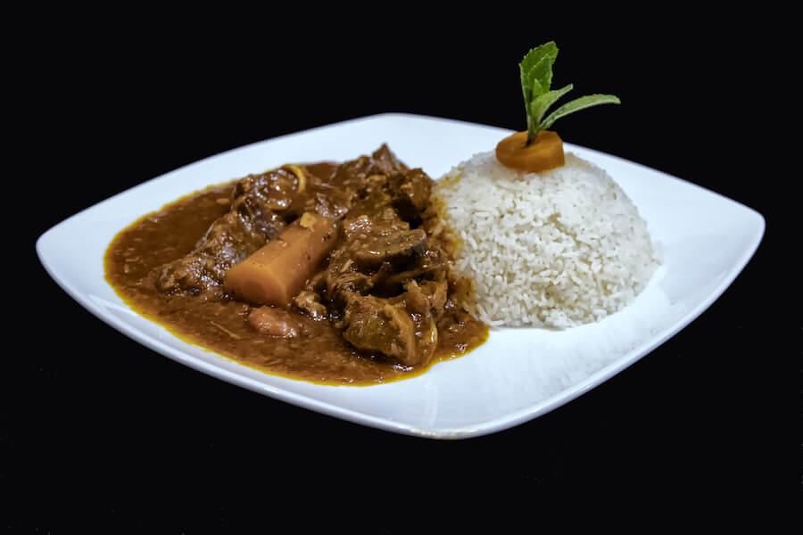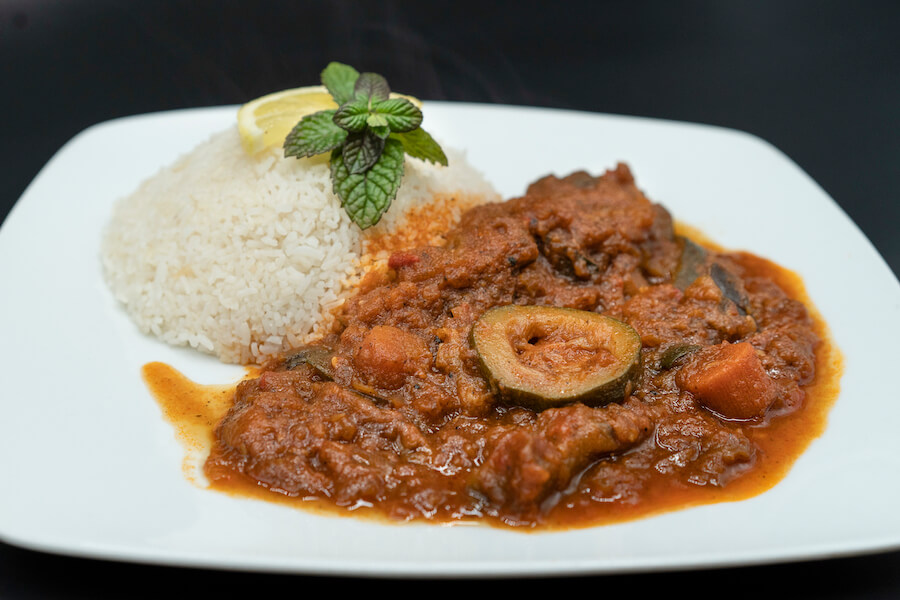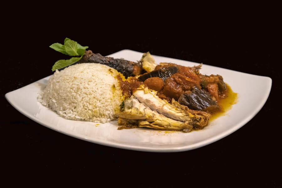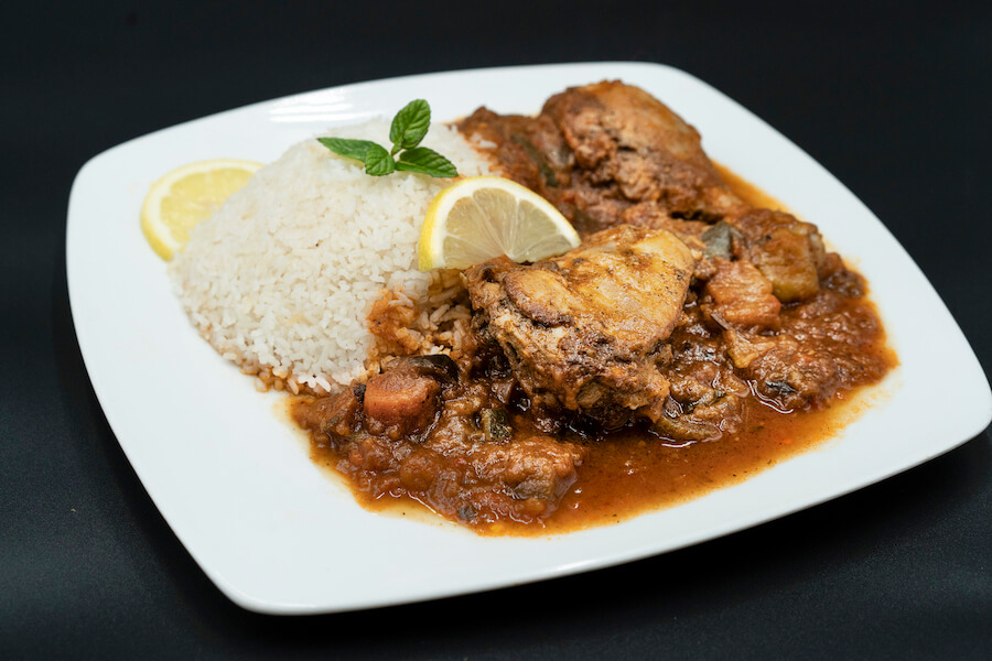 Stufato di pollo o montone con verdure, servito con riso bianco spezzato – Ragoût de poulet ou mounton avec légumes, servi avec du riz blanc cassé – Vegetables sauce with chicken or mutton morsel, served with white broken rice