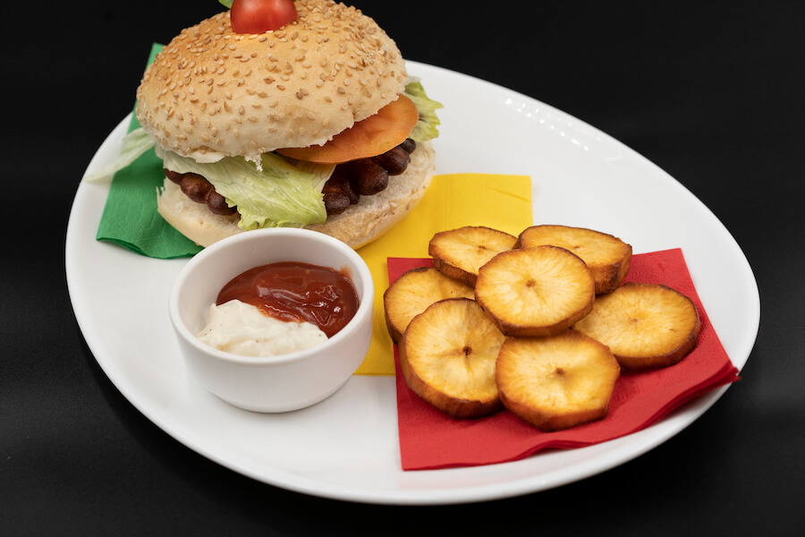 Burger di fagioli occhio nero, lattuga e pomodoro con contorno di patatine, yam o yuca – Burger aux haricots noirs, laitue, tomate, accompagné de chips, igname ou yuca – Blackeye bean pancake, lettuce and tomato burger with a side of potato chips, yam or yuca