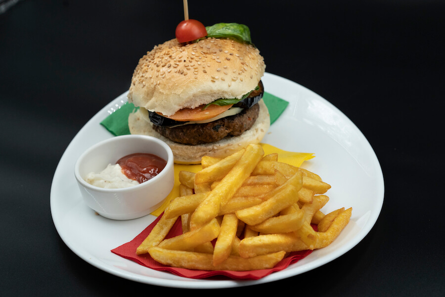 Burger, melanzane fritte, caciotta, pomodoro, basilico, con contorno di patatine, yam o yuca – Burger, aubergines frites, caciotta, tomate, basilic accompagné de chips, igname ou yuca – Burger, fried aubergines, caciotta, tomato, basil with a side of potato chips, yam or yuca