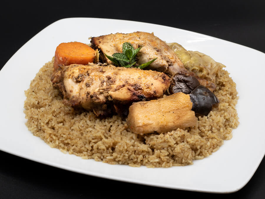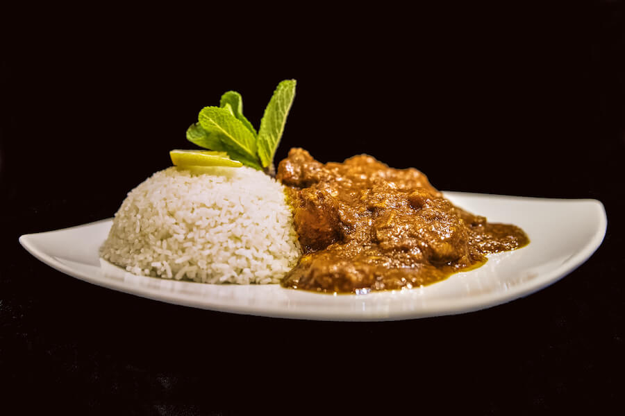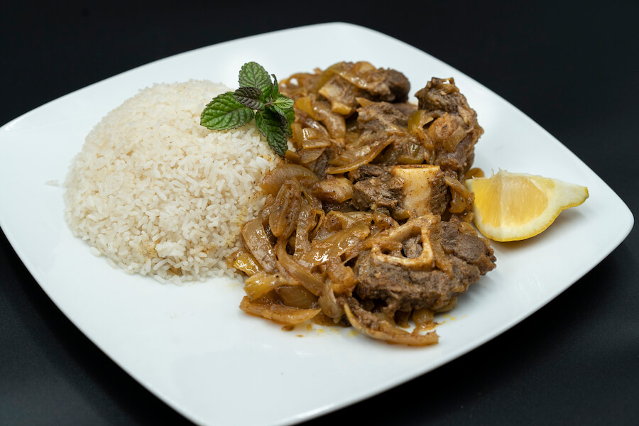 Pollo o montone marinato con cipolle e limone, servito con riso bianco spezzato – Poulet, mounton mariné aux oignons et au citron, avec du riz blanc cassé – Chicken, mutton, stew marinated with onions and lemon, served with broken white rice
