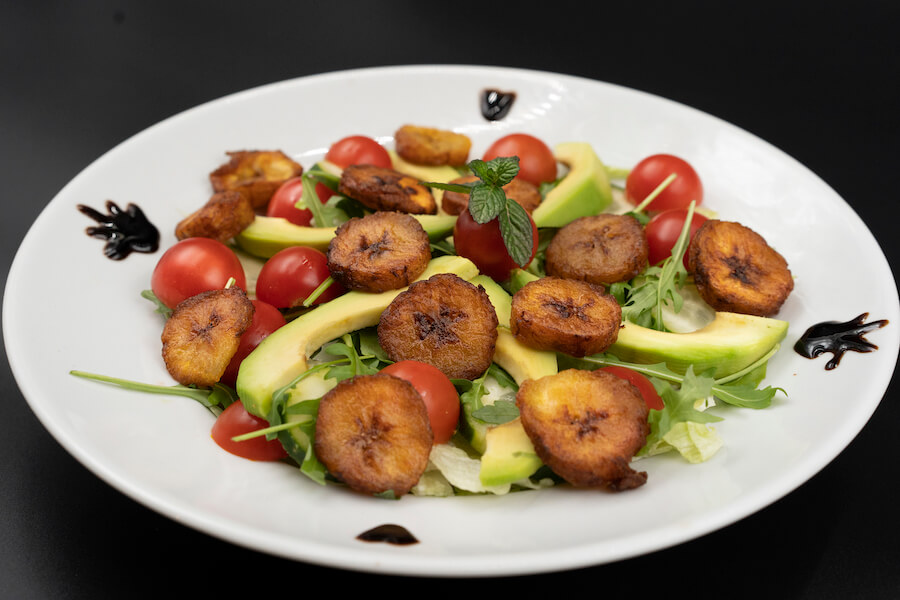 Lattuga, rucola, cetriolo, pomodorini, alloko, avocado, zenzero – Laitue, roquette, concombre, tomates cerises, alloko, avocat, gingembre – Lettuce, rocket, cucumber, cherry tomatoes, alloko, avocado, ginger