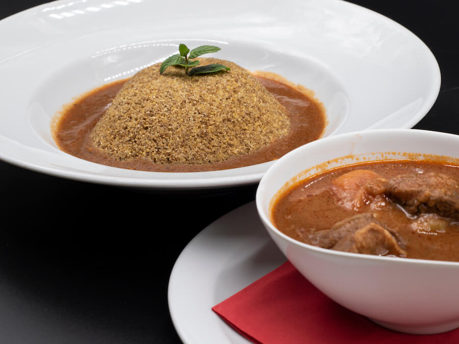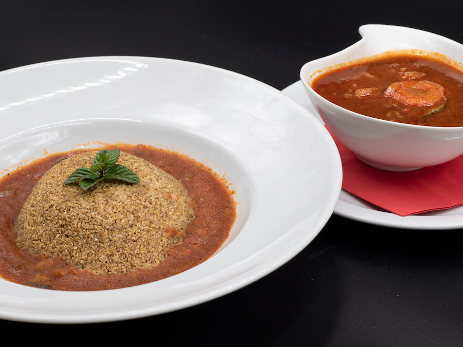 Couscous di miglio accompagnato da una salsa di pomodoro, burro di arachidi, verdure e bocconcini di carne – Couscous de millet accompagné d’une sauce tomate, beurre d’arachides, légumes et morceaux de viande – Millet couscous accompanied by a tomato sauce, peanut butter, vegetables and meet morsels