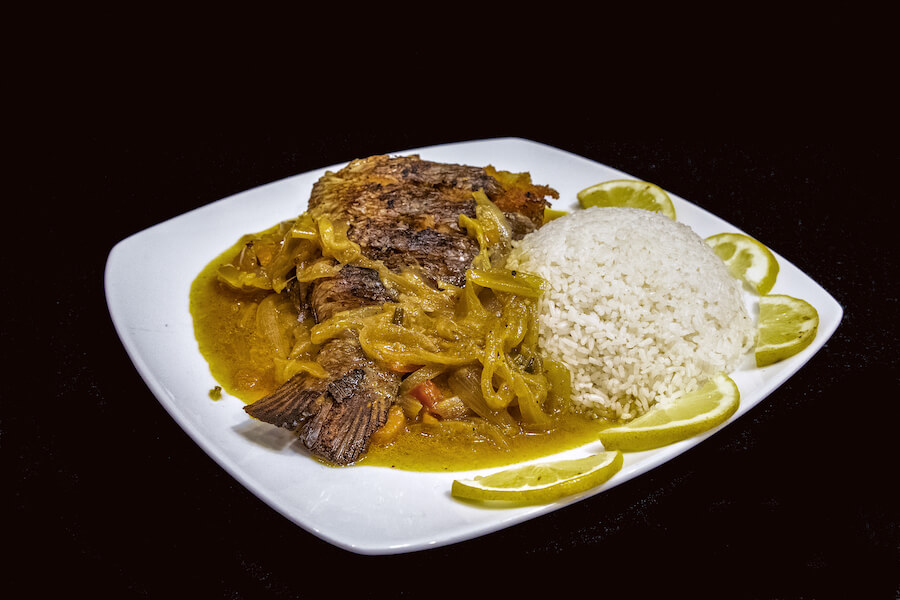Pesce marinato con cipolle e limone, servito con riso bianco spezzato – Poisson mariné aux oignons et au citron, avec du riz blanc cassé – Fish stew marinated with onions and lemon, served with broken white rice